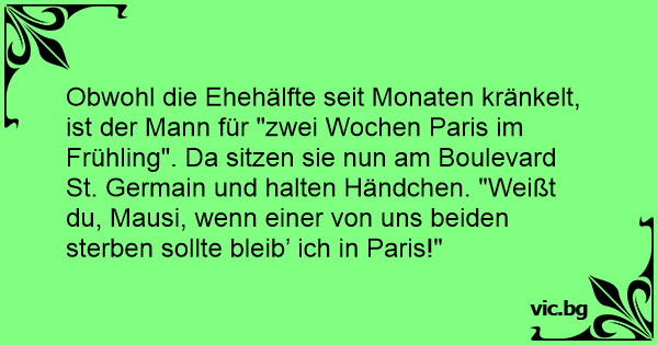 Obwohl die Ehehälfte seit Monaten kränkelt, ist der Mann für "zwei Wochen Paris im Frühling". Da sitzen sie nun am Boulevard St. Germain und halten Händchen. "Weißt du, Mausi, wenn einer von uns beiden sterben sollte bleib’ ich in Paris!"