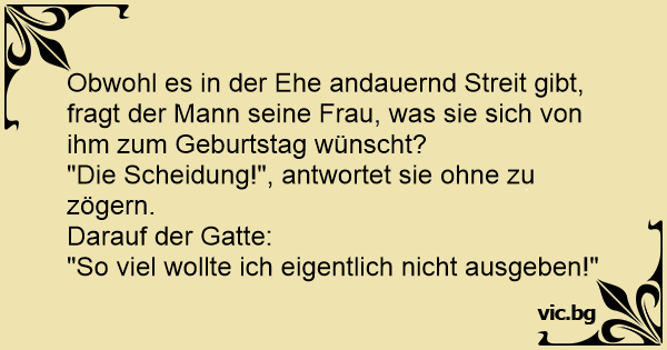 Geburtstagsgeschenk für die Ehefrau A l'approche de la Saint-Valentin, un homme demande à sa femme : John asks his wife, Mary, what she wants to celebrate their 40th wedding anniversary. “Would you like a new Mink Coat?” he asks. “Not really,” says Mary. “Well how about a new Mercedes sports car?” says John. “No,” she responds. “What about a new vacation home in the country?” he suggests. She... - Миличкооо, какъв подарък да ти направя, заради моите капризи? - Развод? - Querida: ¿Qué regalo tengo que hacerte para que olvides mis infideidades? - El divorcio Милейди скоро щяла да има рожден ден и да навърши 49 години. Сър Джон се обърнал към нея: - Милейди, какво желаете да Ви подаря за рождения ден?! - Сър Джон, едно малко скромно разводче ще е чудесно! - Но милейди, нека го оставим за догодина, дайте нещо по-евтино, все пак догодина е юбилеят Ви. Ein Mann fragt seine Ehefrau: "Schatz, was wünschst Du Dir zum Geburtstag?" Sie: "Die Scheidung!" Er: "Na, soviel wollte ich eigentlich nicht ausgeben!" Szkot do żony: - Kochanie, zbliżają się twoje urodziny, możesz mi podsunąć pomysł na prezent? - Chce rozwodu! Chwila ciszy. - Ale ja nie zamierzam tyle wydawać... – Kochanie, co chciałabyś na urodziny? – Rozwód! – Nie planowałem wydawać aż tyle… Jan pyta żonę, jak chce uczcić ich 40-stą rocznicę ślubu. - Chcesz nowe futro z norek? - Nie bardzo. - Hm, a może nowego Mercedesa? - Nie. - A może nowy domek letniskowy gdzieś na wsi? - Nie,... Un gars demande à sa femme : - Qu'est-ce qui te ferait plaisir pour la Saint Valentin ? Je n'ai pas d'idée!...Des fleurs ? - Ce n'est pas très original! - Du parfum ? - Dis tout de suite que je... Man tot echtgenote: "Wat wil je voor Kerstmis?" Zij: "Een echtscheiding!!" Hij: "Heb je niet iets goedkoper?"