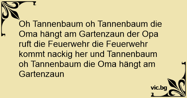 Oh Tannenbaum oh Tannenbaum die Oma hängt am Gartenzaun der Opa ruft die Feuerwehr die Feuerwehr kommt nackig her und Tannenbaum oh Tannenbaum die Oma hängt am Gartenzaun