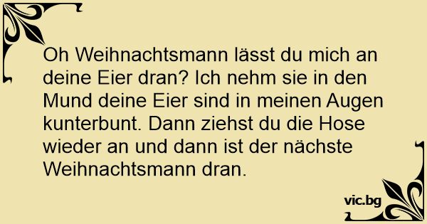 Oh Weihnachtsmann lässt du mich an deine Eier dran? Ich nehm sie in den Mund deine Eier sind in meinen Augen kunterbunt. Dann ziehst du die Hose wieder an und dann ist der nächste Weihnachtsmann dran.