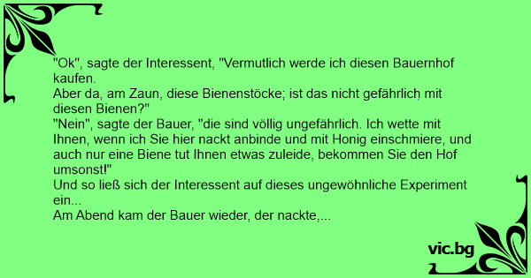 "Nein", sagte der Bauer, "die sind völlig ungefährlich. Ich wette mit Ihnen, wenn ich Sie hier nаскт anbinde und mit Honig einschmiere, und auch nur eine Biene тuт Ihnen etwas zuleide, bekommen Sie den Hof umsonst!"