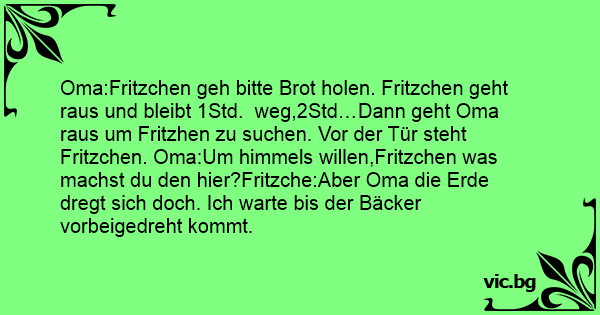 Oma:Fritzchen geh bitte Brot holen. Fritzchen geht raus und bleibt 1Std. weg,2Std…Dann geht Oma raus um Fritzhen zu suchen. Vor der Tür steht Fritzchen. Oma:Um himmels willen,Fritzchen was machst du den hier?Fritzche:Aber Oma die Erde dregt sich doch. Ich warte bis der Bäcker vorbeigedreht kommt.