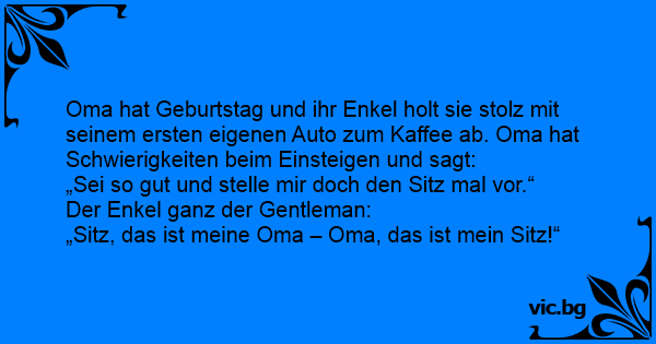 Oma hat Geburtstag und ihr Enkel holt sie stolz mit seinem ersten eigenen Auto zum Kaffee ab. Oma hat Schwierigkeiten beim Einsteigen und sagt:
