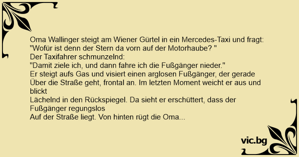 Une blonde monte dans un taxi et demande en montrant l'emblème Mercedes. - Ça sert à quoi ça? - Ça ça sert à viser les mémés sur les passages piétons. Justement ils arrivent devant un passage piéton où une mémé traverse. Le chauffeur fait semblant de la viser mais donne un coup de volant au...