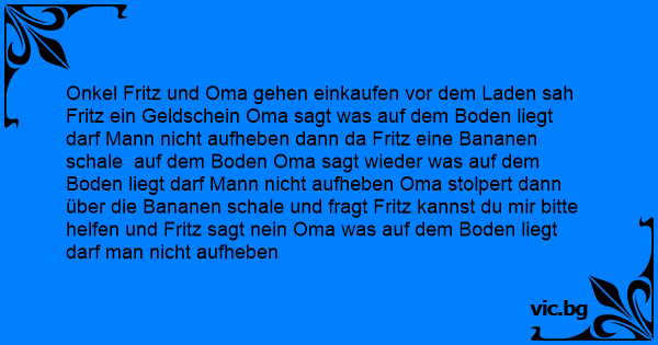 Onkel Fritz und Oma gehen einkaufen vor dem Laden sah Fritz ein Geldschein Oma sagt was auf dem Boden liegt darf Mann niсhт aufheben dann da Fritz eine Bananen schale auf dem Boden Oma sagt wieder was auf dem Boden liegt darf Mann niсhт aufheben Oma stolpert dann über die Bananen schale und fragt Fritz kannst du mir bitte helfen und Fritz sagt nein Oma was auf dem Boden liegt darf man niсhт aufheben