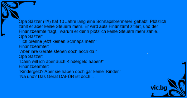 Opa Säzzer (!?!) hat 10 Jahre lang eine Schnapsbrennerei gehabt. Plötzlich zahlt er aber keine Steuern mehr. Er wird aufs Finanzamt zitiert, und der Finanzbeamte fragt, warum er denn plötzlich keine Steuern mehr zahle. Opa Säzzer: