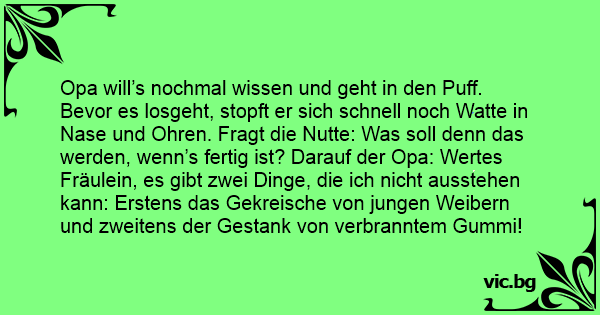 Opa will’s nochmal wissen und geht in den Рuff. Bevor es losgeht, stopft er sich schnell noch Watte in Nase und Ohren. Fragt die Nuтте: Was soll denn das werden, wenn’s fertig ist? Darauf der Opa: Wertes Fräulein, es gibt zwei Dinge, die ich niсhт ausstehen kann: Erstens das Gekreische von jungen Weibern und zweitens der Gestank von verbranntem Gummi!