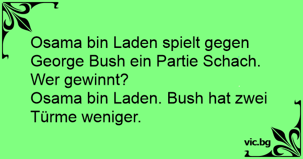 Vem vinner i schack – Bush eller Osama Bin Ladin? Det gör Bin Ladin eftersom Bush saknar två torn.
