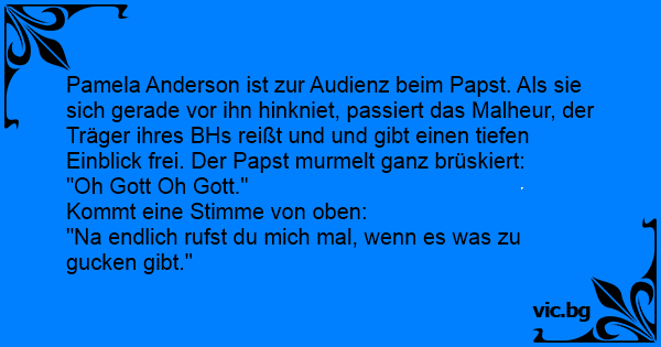 Pamela Anderson ist zur Audienz beim Papst. Als sie sich gerade vor ihn hinkniet, passiert das Malheur, der Träger ihres BHs reißt und und gibt einen tiefen Einblick frei. Der Papst murmelt ganz brüskiert: