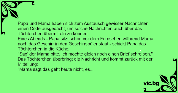 Papa und Mama haben sich zum Austausch gewisser Nachrichten einen Code ausgedacht, um solche Nachrichten auch über das Töchterchen übermitteln zu können.