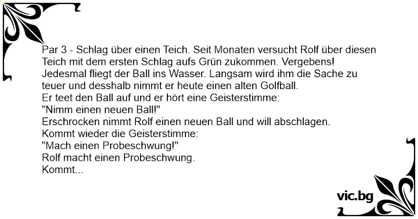 Par 3 - Schlag über einen Teich. Seit Monaten versucht Rolf über diesen Teich mit dem ersten Schlag aufs Grün zukommen. Vergebens! Jedesmal fliegt der Ball ins Wasser. Langsam wird ihm die Sache zu teuer und desshalb nimmt er heute einen alten Golfball.