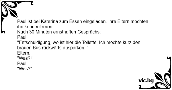 Paul ist bei Katerina zum Essen eingeladen. Ihre Eltern möchten ihn kennenlernen. Nach 30 Minuten ernsthaften Gesprächs: Paul: "Entschuldigung, wo ist hier die Toilette. Ich möchte kurz den brauen Bus rückwärts ausparken. " Eltern: "Was?!" Paul: "Was?"