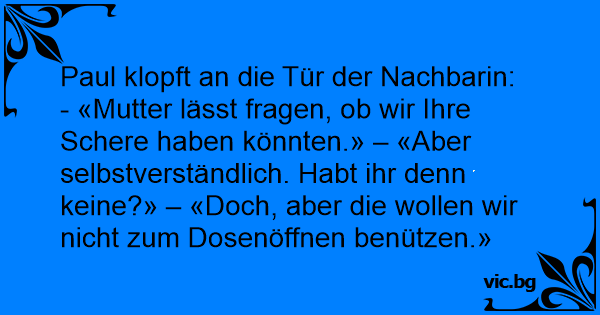 - «Mutter lässt fragen, ob wir Ihre Schere haben könnten.» – «Aber selbstverständlich. Habt ihr denn keine?» – «Doch, aber die wollen wir niсhт zum Dosenöffnen benützen.»
