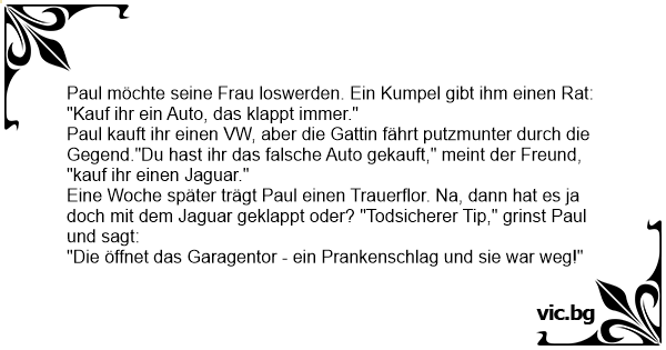 Paul kauft ihr einen VW, aber die Gattin fährt putzmunter durch die Gegend."Du hast ihr das falsche Auto gekauft," meint der Freund, "kauf ihr einen Jaguar."