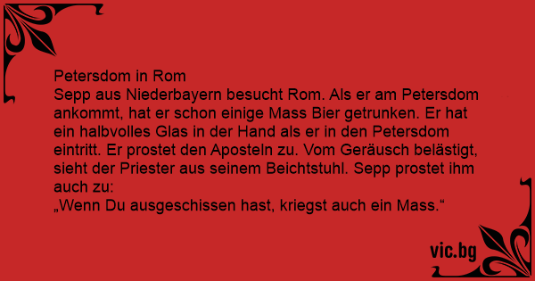 Sepp aus Niederbayern besucht Rom. Als er am Petersdom ankommt, hat er schon einige Mass Bier getrunken. Er hat ein halbvolles Glas in der Hand als er in den Petersdom eintritt. Er prostet den Aposteln zu. Vom Geräusch belästigt, sieht der Priester aus seinem Beichtstuhl. Sepp prostet ihm auch zu: