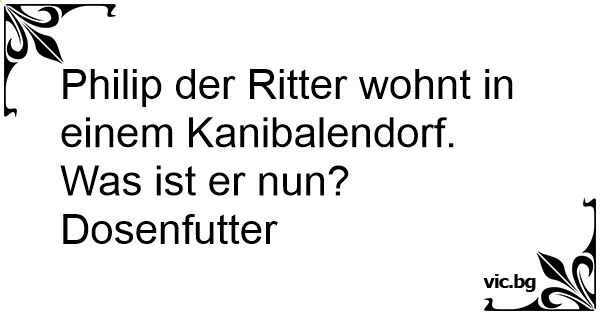 Finden zwei Kannibalen (irgendwann im Mittelalter) einen Kreuzritter schlafend unter einer Palme. Meint der eine enttäuscht zum anderen: „Mist, schon wieder Dosenfraß!“