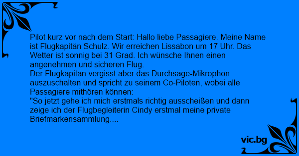 Pilot kurz vor nach dem Start: Hallo liebe Passagiere. Meine Name ist Flugkapitän Schulz. Wir erreichen Lissabon um 17 Uhr. Das Wetter ist sonnig bei 31 Grad. Ich wünsche Ihnen einen angenehmen und sicheren Flug.