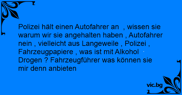 Polizei hält einen Autofahrer an , wissen sie warum wir sie angehalten haben , Autofahrer nein , vielleicht aus Langeweile , Polizei , Fahrzeugpapiere , was ist mit Alkohol Drogen ? Fahrzeugführer was können sie mir denn anbieten