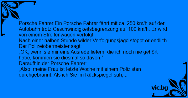 Mannen var ute och provkörde sin nya sportiga Porsche. Han fällde ned taket och tryckte på gasen och när han körde över 120 km/h såg han blinkande blåljus bakom sig. Han hade blivit något fartblind...
