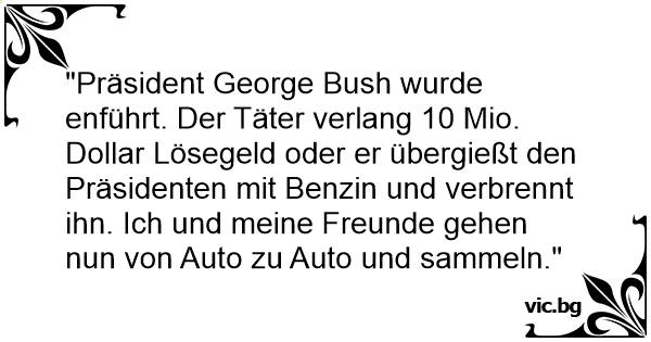 "Präsident George Bush wurde enführt. Der Täter verlang 10 Mio. Dollar Lösegeld oder er übergießt den Präsidenten mit Benzin und verbrennt ihn. Ich und meine Freunde gehen nun von Auto zu Auto und sammeln."