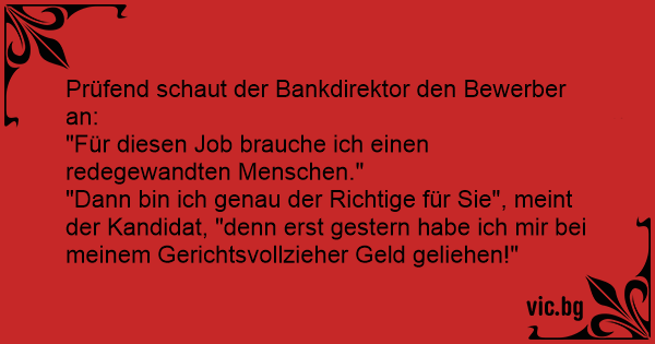 "Dann bin ich genau der Richtige für Sie", meint der Kandidat, "denn erst gestern habe ich mir bei meinem Gerichtsvollzieher Geld geliehen!"