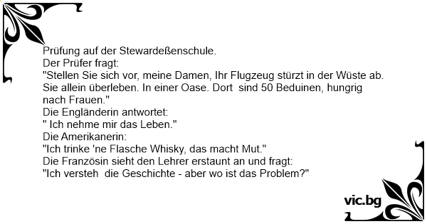 "Stellen Sie sich vor, meine Damen, Ihr Flugzeug stürzt in der Wüste ab. Sie allein überleben. In einer Oase. Dort sind 50 Beduinen, hungrig nach Frauen."