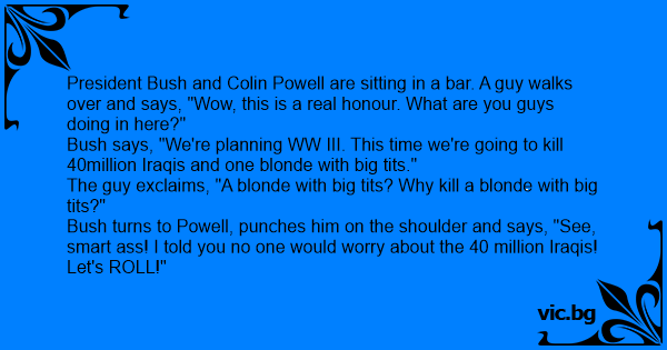 Bush turns to Powell, punches him on the shoulder and says, "See, smart аss! I told you no one would worry about the 40 million Iraqis!