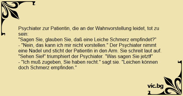 - "Nein, das kann ich mir niсhт vorstellen." Der Psychiater nimmt eine Nadel und sticht der Patientin in den Arm. Sie schreit laut auf. "Sehen Sie!" triumphiert der Psychiater. "Was sagen Sie jetzt!"