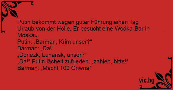 Putin bekommt wegen guter Führung einen Tag Urlaub von der Hölle. Er besucht eine Wodka-Bar in Moskau.