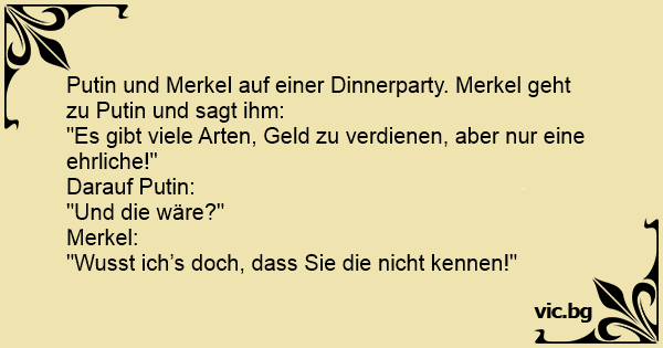 Putin und Merkel auf einer Dinnerparty. Merkel geht zu Putin und sagt ihm: