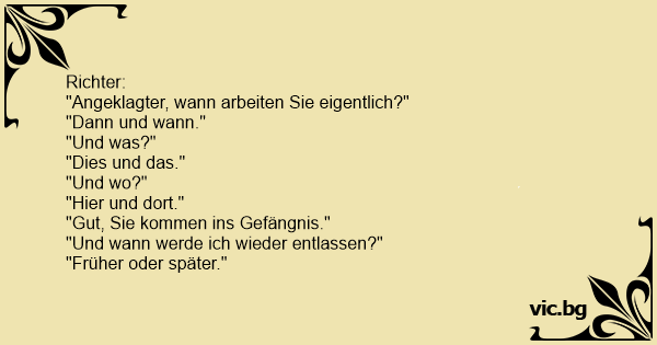 Richter zum Angeklagten: "Wann arbeiten sie eigentlich?" "Dann und wann." "Und was arbeiten sie?" "Dies und das." "Und wo?" "Hier und dort." "Ok, Sie kommen ins Gefängnis!" "Und wann komm ich wieder raus?" "Früher oder später!"