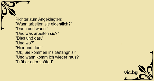 Richter: "Angeklagter, wann arbeiten Sie eigentlich?" "Dann und wann." "Und was?" "Dies und das." "Und wo?" "Hier und dort." "Gut, Sie kommen ins Gefängnis." "Und wann werde ich wieder entlassen?" "Früher oder später."