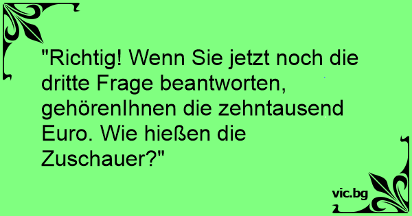 "Richtig! Wenn Sie jetzt noch die dritte Frage beantworten, gehörenIhnen die zehntausend Euro. Wie hießen die Zuschauer?"