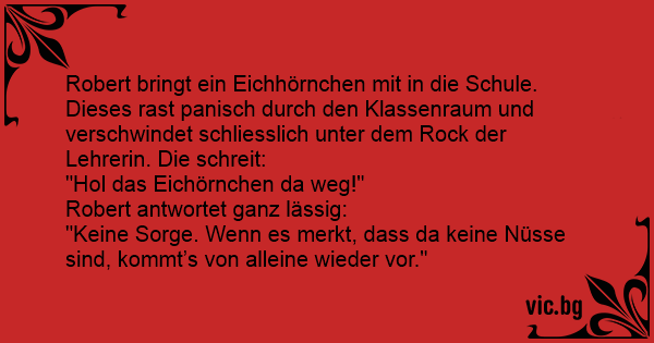 Robert bringt ein Eichhörnchen mit in die Schule. Dieses rast panisch durch den Klassenraum und verschwindet schliesslich unter dem Rock der Lehrerin. Die schreit: