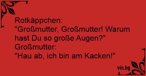 Црвенкапа Rotkäppchen und der Wolf Червената Шапчица си върви из гората и вижда в храстите Кумчо Вълчо с очи като палачинки. C'est le petit chaperon rouge qui va apporter une galette à sa grand-mère. Das Rotkäppchen geht durch den Wald, da trifft es den bösen Wolf hinter einem Busch. Das kleine Rotkäppchen schlendert durch den Wald in Richtung Großmutters Haus. Sie hat wie üblich ihren Korb mit. Rotkäppchen: "Aber Wolf, warum hast Du so große Augen?" Darauf der Wolf: "Verflixt noch mal, kann man denn hier nicht mal in Ruhe kacken!" ¡Que orejas mas rojas tienes Lobo! Sí... ¡Lobo, que hinchadas tienes las venas del cuello! Sí... ¡ Lobo, que cara más colorada tienes! Sí... !Lobo, que apretados tienes los dientes! Coño Caperucita, ¿me quieres dejar cagar en paz? Estaba Caperucita cantando en el bosque y vio al lobo y dijo: - Ya te vi lobo, estás detrás de ese árbol, y volvió a cantar tranquilamente. De nuevo lo ve al lobo y dice: - Ya te vi lobo, estás detrás de ese arbusto, y volvió a cantar. Se lo encuentra de nuevo y dice Caperucita: - Ya te vi lobo,... Iba caminando la Caperucita Roja por el bosque, cuando de repente se encuentra al lobo feroz y esta le dice: - ¡Qué orejas más rojas tienes Lobo! - Sí... - ¡Lobo, qué hinchadas tienes las venas del cuello! - Sí... - ¡Lobo, qué cara más colorada tienes! - Sí... - ¡Lobo, qué apretados tienes los... Le petit chaperon rouge va voir sa grand-mère quand, tout à coup, elle aperçoit le grand méchant loup tapi derrière un buisson. - Oh ! Comme vous avez de grands yeux, lui dit-elle. Et le loup s'enfuit sans demander son reste... Un peu plus loin sur son chemin, le petit chaperon rouge voit le même... Idzie Czerwony Kapturek przez las, nagle zauważyła wilka: - Wilku, dlaczego masz takie wielki oczy? - Myk, myk Czerwony Kapturku - nie widzisz, że sram? Rotkäppchen geht durch den Wald und trifft hinter einem Gebüsch den bösen Wolf. Fragt Rotkäppchen: "Du Wolf, warum hast du denn so große Augen?" Darauf der Wolf: "Nicht mal in Ruhe scheißen kann... Llega caperucita donde su abuelita y le dice: - ¿Abuelita, porque tienes los ojos tan grandes? - ¡Cállate y déjame cagar en paz! Va Caperucita Roja por el bosque y ve unas orejas detrás de unos arbustos: - Lobo Feroz, Lobo Feroz, que te estoy viendo... Las orejas desaparecen y Caperucita sigue caminando. A los cien metros,... Caperucita se encuentra con el lobo en medio del bosque y le dice: - Lobo, ¡qué orejas más coloradas tienes! - Sí... - Lobo, ¡qué cara más roja tienes! - Sí... - Y... ¡qué hinchadas tienes las... Chapeuzinho Vermelho está andando pela floresta, para levar seus docinhos para vovozinha, quando vê uma moita se mexendo. Sem conseguir conter a sua curiosidade, espia atrás da moita e dá de cara... Rødhætte Den lille Rødhætte er på vej igennem skoven for at besøge sin bedstemor. Pludselig får hun øje på ulven, som sidder på hug bag en busk. - "Hvorfor har du sådan nogle store ører? - "Det er... Roodkapje komt in het bos en ziet opeens de boze wolf achter een boom zitten. Ze loopt er naartoe en zegt: "Wolf wat heb je klein oogjes." Waarop de wolf antwoordt: "Rot op, ik zit te schijten." Det var lille Rødhætte, som var ude i skoven Det var lille Rødhætte, som var ude i skoven. Der mødte hun den store stykke ulv. Hvorfor har du så store øre? spurgte hun. Det er for jeg bedre kan... -Lobo, que orejas mas coloradotas tienes! - Si... - Lobo, que cara más roja tienes! - Si... - Lobo, que hinchadas tienes las venas del cuello! - Si... - Lobo, que apretados tienes los dientes! -... Había una vez... Una pequeña Caperucita Roja que paseaba por el bosque, cuando de pronto vió al gran lobo malo detrás de un matorral. Ella le dijo: - Ya te vi, lobo malvado, pero véte, no te tengo... Va Caperucita Roja cantando por el bosque: - Soy Caperucita Roja, una niña muy feliz... Cuando de pronto ve al lobo y le dice: - Señor Lobo, ¡ya lo vi detrás de ese árbol! El lobo sale... Intr-o zi Scufita Rosie se ducea la bunicuta. Deodata apare de dupa un tufis capul unui lup. Scufita Rosie il intreaba: - Lupule, de ce ai urechile atat de mari? - Ca sa aud mai bine. - Lupule, dar... Punahilkka oli menossa viemään isoäidilleen eväskoria ja joutui kävelemään metsän halki. Yhtäkkiä hän näki pusikossa ison pahan suden. Hän kysyi: - Miksi sinulla on niin suuret silmät? Johon iso...