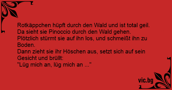 Geht Rotkäppchen dir den Wald und ist so richtig geil. Trifft sie Ponocchio, setzt sich nackt auf sein Gesicht und schreit: „Lüg mich an, Lüg mich an!“