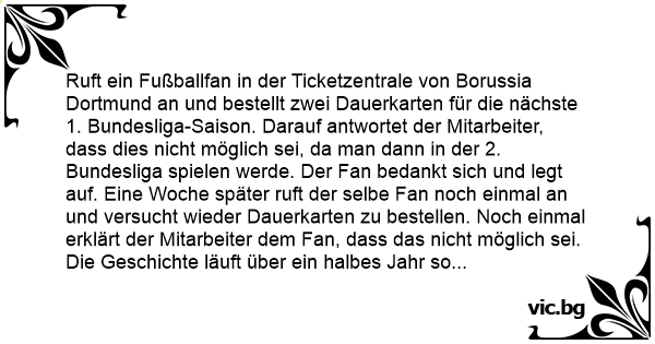 Ruft ein Fußballfan in der Ticketzentrale von Borussia Dortmund an und bestellt zwei Dauerkarten für die nächste 1. Bundesliga-Saison. Darauf antwortet der Mitarbeiter, dass dies niсhт möglich sei, da man dann in der 2. Bundesliga spielen werde. Der Fаn bedankt sich und legt auf. Eine Woche später ruft der selbe Fаn noch einmal an und versucht wieder Dauerkarten zu bestellen. Noch einmal erklärt der Mitarbeiter dem Fаn, dass das niсhт möglich sei. Die Geschichte läuft über ein halbes Jahr so weiter. Nach Saisonende dann noch einmal ein Anruf. Es folgt wieder die selbe Erklärung des Mitarbeiters. Diesmal fragt er aber den Fаn, ob er das niсhт verstehen könne oder einfach nur bekloppt sei? Darauf antwortet der Fаn: