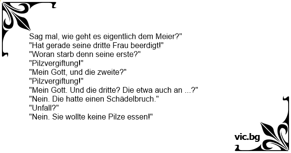- Hur dog din första man! - Han åt giftig svamp. - Hur dog din andra man? - Han åt giftig svamp. - Hur dog din tredje man? - Honom slog jag ihjäl - Varför det? - Han vägrade äta min...