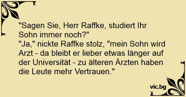 "Ja," nickte Raffke stolz, "mein Sohn wird Arzt - da bleibt er lieber etwas länger auf der Universität - zu älteren Ärzten haben die Leute mehr Vertrauen."