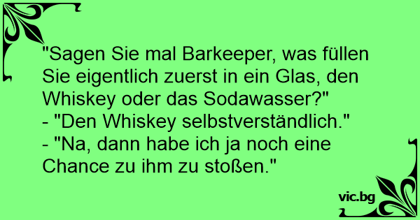 "Sagen Sie mal Barkeeper, was füllen Sie eigentlich zuerst in ein Glas, den Whiskey oder das Sodawasser?"
