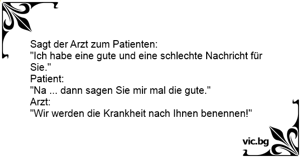 Доктор към пациента: - С добрата или лошата новина да почна? Do you want the good news or the bad news? Der Arzt bittet seinen Patienten in den Behandlungsraum und sagt: Er komt een man bij de dokter. Zegt de dokter: "Ik heb een goed bericht en een slecht bericht. "Nou, zegt de patiënt, "dan eerst maar het goede bericht." Waarop de dokter zegt: "We gaan een... - Mam dla pana dwie wiadomości: jedną złą, drugą dobrą - mówi lekarz do pacjenta. - To ja poproszę najpierw tę dobrą. - Kolegium medyczne zadecydowało, że nazwiemy tę chorobę pańskim nazwiskiem. O médico diz para seu paciente: — Sr. Kraftzenstein, tenho uma boa e uma má notícia para o senhor! O paciente diz: — Vai, manda a boa primeiro. O médico responde: — A doença que o Sr. tem foi... Bemegy az orvos a kórteremben fekvő pácienshez: - Van egy rossz és egy jó hírem. Melyikkel kezdjem? - kérdi a doki. - A jó hírrel, doktor úr! - feleli a beteg reménykedve. - Nos, ezt a betegséget,... Il dottore al paziente: “Dan, ho buone e cattive notizie per te”. E Dan: “Dottore, mi dica le buone”. Il dottore: “Daranno il tuo nome alla tua malattia”. Le médecin dit à son patient : - Désolé, monsieur Durand, mais j'ai une bonne nouvelle et aussi, malheureusement, une très mauvaise  nouvelle à vous annoncer! - Ben, commencez donc par la très... - Kedves beteg! Van egy jó hírem, és egy rossz. Melyikkel kezdjem? - Kezdje a rossz hírrel, doki! - Ön olyan betegséget kapott, amit sajnos még nem ismer a mai orvostudomány! - És mi a jó hír? - Ha... Medicul către pacient: - Domnule, am nişte veşti bune şi nişte veşti proaste. Cu care să încep? - Dă-mi o veste bună, doctore! - Boala asta va purta numele tău!