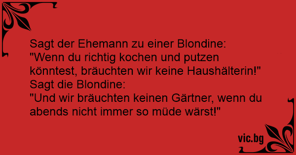 Ehemann einer Blondine: "Wenn du es mal lernen Würdest wie man bügelt und kocht, dann könnten wir die Haushälterin sparen." Blondine: "Und wenn du es mal Lernen würdest, wie man es im Bett richtig...