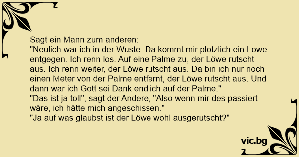 "Neulich war ich in der Wüste. Da kommt mir plötzlich ein Löwe entgegen. Ich renn los. Auf eine Palme zu, der Löwe rutscht aus. Ich renn weiter, der Löwe rutscht aus. Da bin ich nur noch einen Meter von der Palme entfernt, der Löwe rutscht aus. Und dann war ich Gott sei Dank endlich auf der Palme."