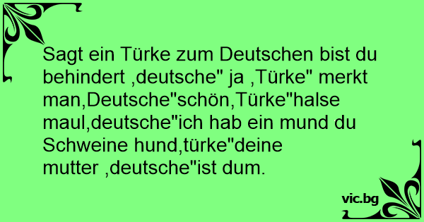 Sagt ein Türke zum Deutschen bist du behindert ,deutsche" ja ,Türke" merkt man,Deutsche"schön,Türke"halse maul,deutsche"ich hab ein mund du Schweine hund,türke"deine mutter ,deutsche"ist dum.