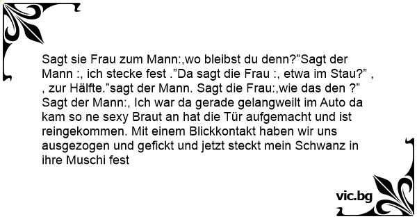 Sagt sie Frau zum Mann:,wo bleibst du denn?”Sagt der Mann :, ich stecke fest .”Da sagt die Frau :, etwa im Stau?” , , zur Hälfte.”sagt der Mann. Sagt die Frau:,wie das den ?” Sagt der Mann:, Ich war da gerade gelangweilt im Auto da kam so ne sеxy Braut an hat die Tür aufgemacht und ist reingekommen. Mit einem Blickkontakt haben wir uns ausgezogen und gefickt und jetzt steckt mein Sсhwаnz in ihre Мusсhi fest