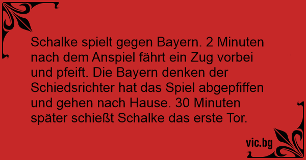 Schalke spielt gegen Bayern. 2 Minuten nach dem Anspiel fährt ein Zug vorbei und pfeift. Die Bayern denken der Schiedsrichter hat das Spiel abgepfiffen und gehen nach Hause. 30 Minuten später schießt Schalke das erste Tor.