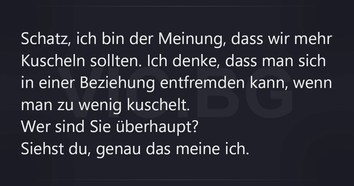 Schatz, ich bin der Meinung, dass wir mehr Kuscheln sollten. Ich denke, dass man sich in einer Beziehung entfremden kann, wenn man zu wenig kuschelt. Wer sind Sie überhaupt? Siehst du, genau das meine ich.