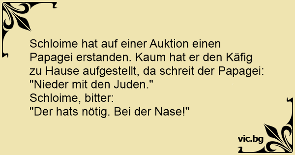 Schloime hat auf einer Auktion einen Papagei erstanden. Kaum hat er den Käfig zu Hause aufgestellt, da schreit der Papagei: