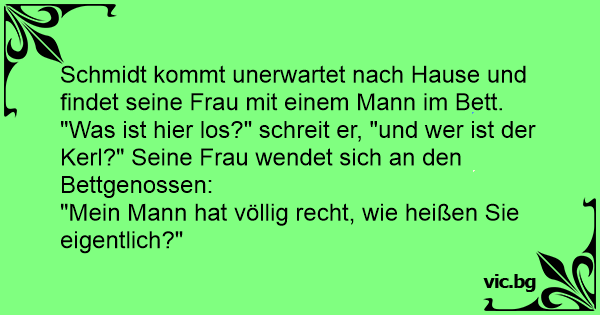 Schmidt kommt unerwartet nach Hause und findet seine Frau mit einem Mann im Bett. "Was ist hier los?" schreit er, "und wer ist der Kerl?" Seine Frau wendet sich an den Bettgenossen: