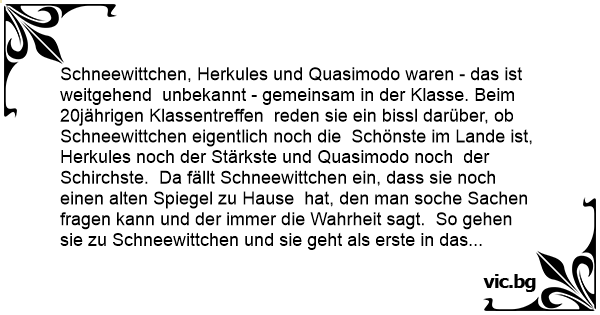 Schneewittchen, Herkules und Quasimodo waren - das ist weitgehend unbekannt - gemeinsam in der Klasse. Beim 20jährigen Klassentreffen reden sie ein bissl darüber, ob Schneewittchen eigentlich noch die Schönste im Lande ist, Herkules noch der Stärkste und Quasimodo noch der Schirchste. Da fällt Schneewittchen ein, dass sie noch einen alten Spiegel zu Hause hat, den man soche Sachen fragen kann und der immer die Wahrheit sagt. So gehen sie zu Schneewittchen und sie geht als erste in das Zimmer mit dem Spiegel. Als sie rauskommt erzählt sie freundenstrahlend, dass sie noch immer die Schönste im ganzen Land ist. Danach geht Herkules zum Spiegel und kommt sofort wieder mit strahlendem Lächeln zurück, denn er ist noch immer der Stärkste. Zum schluss geht Quasimodo zum Spiegel. 10 Minuten vergehen, 20 Minuten vergenen, 30 Minuten vergehen... Plötzlich kommt Quasimodo aus dem Zimmer, schaut Schneewittchen und Herkules an und fragt: